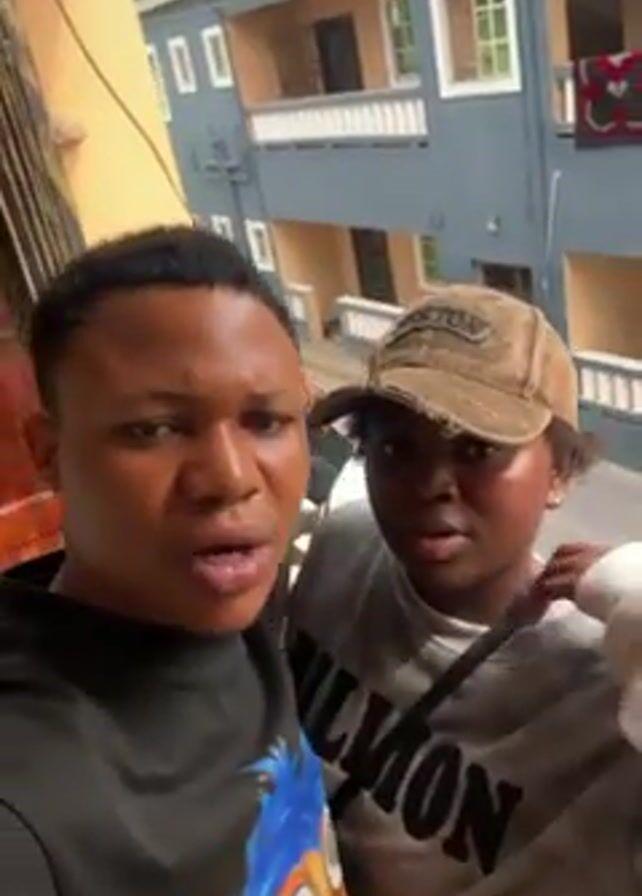 two people, a man and a woman, standing close together on a balcony or porch. The man, on the left, is holding a phone and appears to be recording a video of himself and the woman. He is wearing a black sweatshirt with a colorful cartoon character on it. The woman, standing next to him on the right, is wearing a gray sweatshirt and a worn brown baseball cap. She seems to be adjusting her shirt or fiddling with something near her neck. In the background, there is a multi-story building painted in gray and light brown, with visible windows and balconies. The overall setting appears to be a residential area.