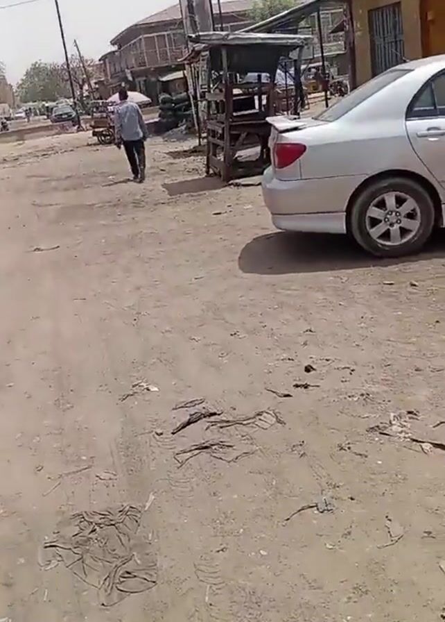 street in a neighborhood, apparently during the day, under a somewhat hazy sky. The road is unpaved, covered in dirt and littered with debris. A man in a light blue shirt and dark pants walks away from the camera down the road. There are structures on both sides of the street, including a wooden frame possibly used for a shop. A silver Toyota Corolla is parked on the right side of the road. A child in a light shirt and pants walks behind the car. Power lines are visible overhead. Other structures, parked vehicles and people can be seen further down the road.
