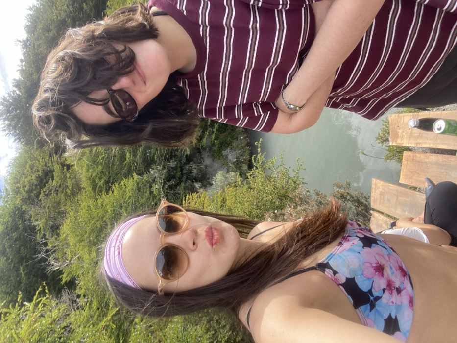 Two young women are posing for a selfie. One is wearing a striped shirt and sunglasses; the other has on a floral bikini top and a headband. They are outdoors with trees in the background. Water is visible between them. There are also bottles and legs of other people on a boardwalk, implying more individuals are present. The image is rotated counterclockwise.