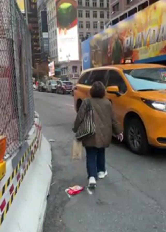 A woman walks along a narrow city street lined with construction barriers, trash, parked cars, and a bright yellow taxi. The woman is wearing a brown quilted jacket, blue jeans, and white sneakers. She carries a brown and black striped tote bag on her shoulder and a paper bag in her hand. The background shows tall buildings with large digital billboards displaying various advertisements. The scene appears to be a busy urban environment.