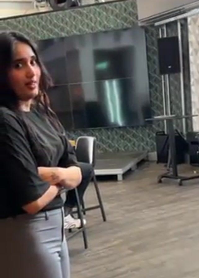 young woman in a black top and gray pants standing in a room. She turns to smile at someone sitting at a table. The room appears to be a studio or event space. Behind the woman is a large video wall, a speaker on a stand, and some chairs. There is a drum kit visible in the background. The floor is a light-colored wood.