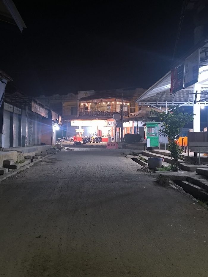 The image depicts a nighttime street scene in the city of Manetunong, Indonesia. The perspective is from the center of a dark, asphalt road looking forward towards a series of buildings. On the left, a row of single-story structures with closed metal shutters appears mostly dark, with a single bright light source illuminating a small section. Directly ahead and slightly to the right, a two-story building features a brightly lit upper balcony area with seating and signage, including the word "KOPI." Below the balcony, the ground floor is also brightly illuminated. Approximately eight motorcycles are parked in front of this building, partially obscured by red barriers. To the far right, a large white awning structure covers an open area, brightly lit by white fluorescent lights. Under this awning, a small green kiosk stands beside a young tree, and several orange plastic chairs with a table are visible. The sky above is completely dark, indicating night. No individuals are clearly visible in the scene. The road surface is uneven, with visible cracks and worn pavement on the edges, and concrete steps leading up to the buildings.