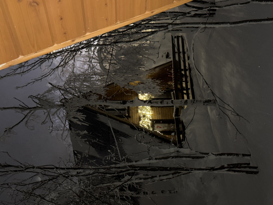 The image captures a snowy scene with a building reflecting in a body of water. The reflection shows a lit Christmas tree inside the building. Snow-covered trees with bare branches frame the reflection, adding depth and texture. The top corner of a wooden structure is visible, suggesting a nearby building or roof. The overall impression is a quiet, wintery scene with festive lights.