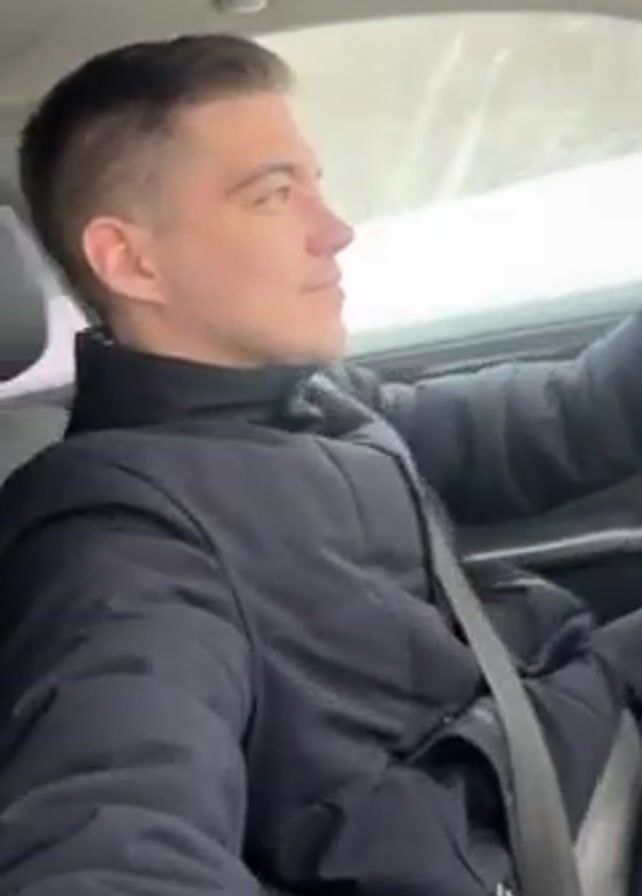 man driving a car on a snowy road. He is wearing a black puffy jacket and has a seatbelt on. The road is covered in snow, and there are large piles of snow on the sides of the road. The windshield wipers are on. A large truck can be seen in the distance ahead of the car.