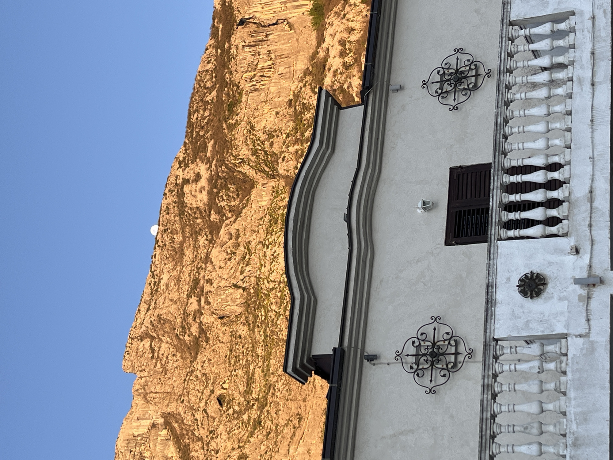 The image depicts a building in Dobrota, Montenegro, adjacent to a rocky cliff face under a clear sky with a visible moon. The building has a white facade adorned with wrought-iron decorative elements and a balustraded balcony. A partially open window with dark shutters is visible on the building's wall. The cliff is textured, with shades of brown and golden hues suggesting sunlight illumination.