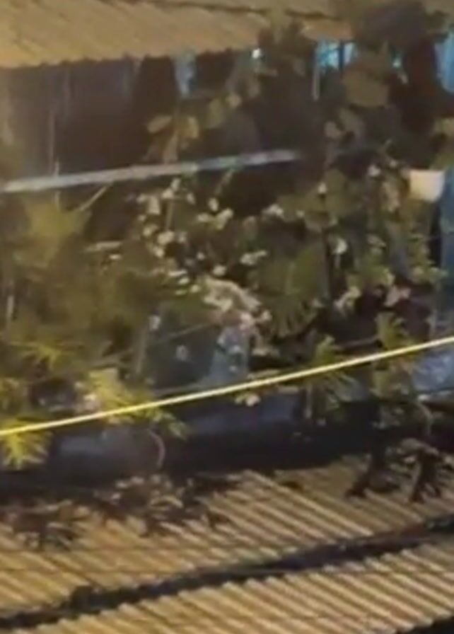 At night, the video shows a view of a rooftop garden in an urban setting. The garden contains various green plants, including what appears to be a Monstera plant with its distinctive split leaves. The plants are surrounded by buildings. The view is shot from a lower vantage point, looking up at the rooftop garden. There is also some visible wiring on the roof. There are sounds of indistinct conversation.