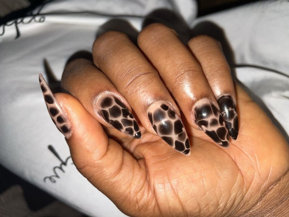 The image depicts a close-up view of a human hand, specifically the left hand, in Sabon Tasha, Nigeria. The hand has dark brown skin. All visible fingernails are artificial, elongated, and shaped in a sharp stiletto style. Each nail features a distinct pattern of irregular, dark brown blotches against a translucent light tan or pinkish-beige base, resembling an animal print, possibly giraffe or leopard. Visible nail regrowth is present at the cuticle line on several nails. The hand is held stationary, displaying the nails. The background is out of focus, consisting of a light-colored, possibly white, soft fabric material with faint, dark cursive script visible in various areas. The lighting is soft and even.