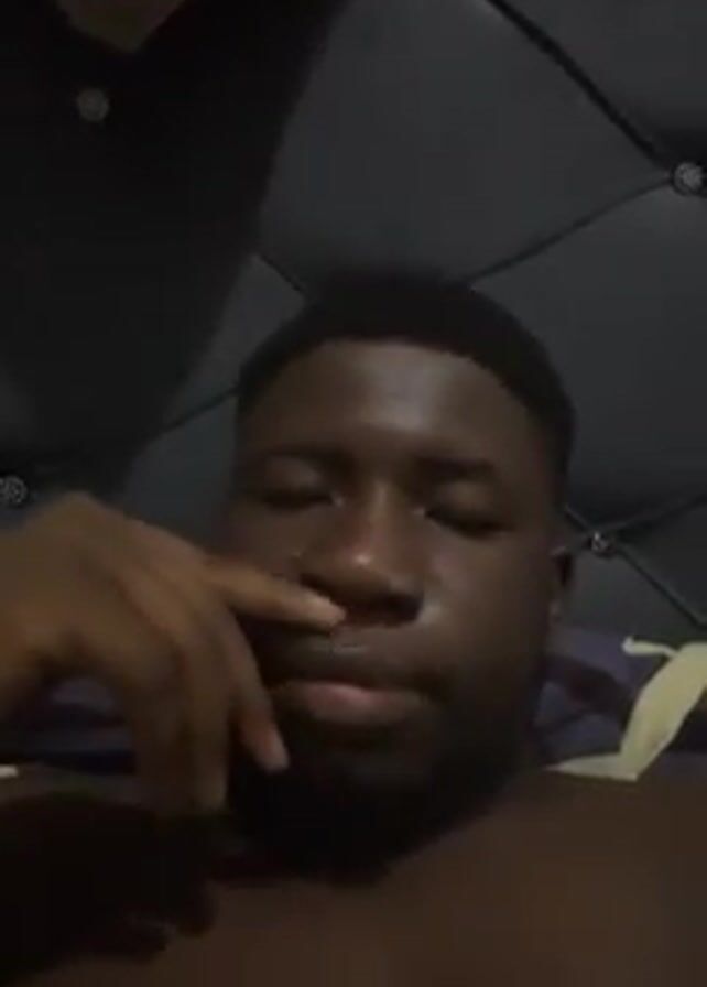 A close-up, low-angle video shows a shirtless young Black man indoors