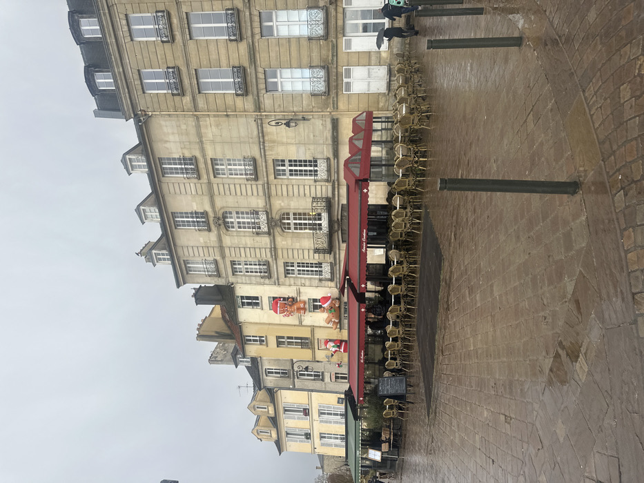 This image depicts a wet cobblestone plaza in Saint-Germain-en-Laye, France, under an overcast sky
