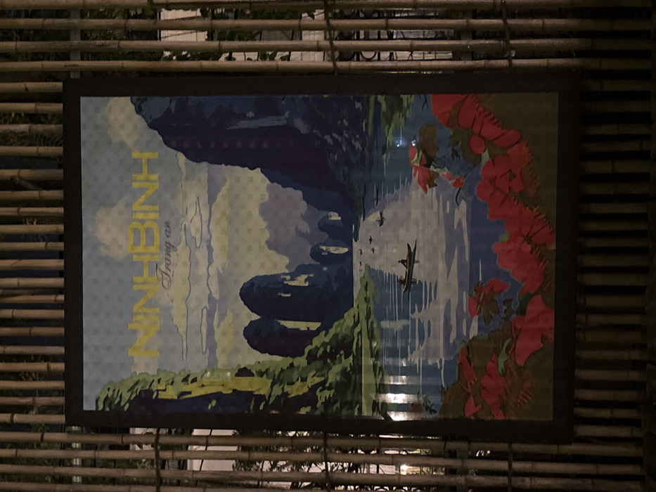 A large, vertically oriented promotional poster is centered in the frame, mounted outdoors against a backdrop of evenly spaced vertical bamboo poles. The poster depicts a stylized landscape of Tràng An, Ninh Bình, Vietnam, with the words "NINH BINH" in yellow capital letters and "Tràng an" below. The artwork portrays a wide river reflecting a light blue sky and clouds, flanked by towering, verdant limestone karsts. Multiple small, dark boats, one containing two figures, are visible on the water. The foreground of the illustration features vibrant red, broad-leaved foliage. The scene is dimly lit, consistent with nighttime conditions. This physical installation is located in Nam Hoa Lư Ward, Vietnam.