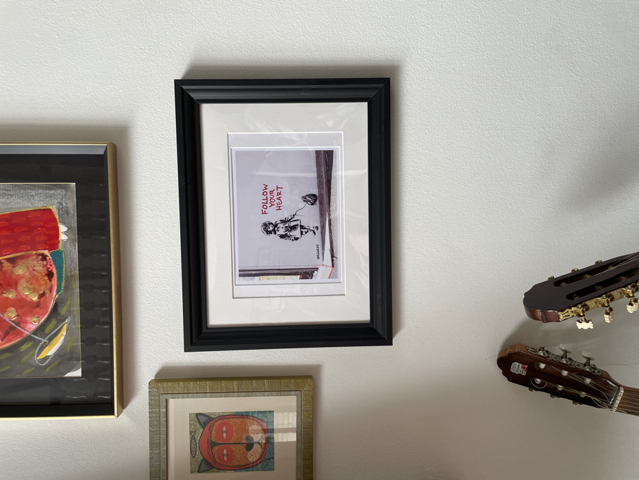 framed print of a Banksy artwork depicting a young girl walking down a street with a red balloon in her hand. The print is displayed on a white wall in a home in Santiago, Chile (latitude: -33.387, longitude: -70.583). The image also includes a second framed print of an abstract painting above the Banksy artwork, as well as two guitars leaning against the wall. The image is taken from a slightly low angle, showcasing the wall and the framed prints in a minimalist style.