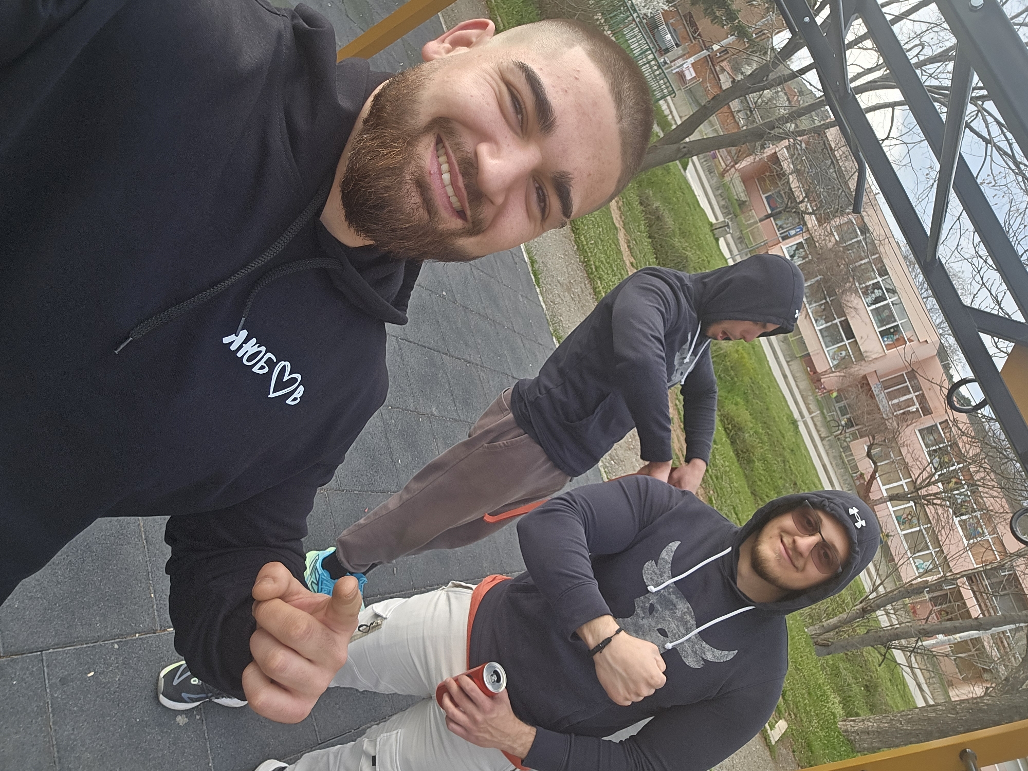 Three men are outdoors. The man in the foreground has a beard and a shaved head. He is wearing a black hoodie. The man to his right is wearing a similar black hoodie with sunglasses and holding a can of soda. The third man is wearing a black hoodie and brown pants. The ground is made of grey and black squares. In the background is a pink building, trees and grass. The location is near the city of Buhovo, Bulgaria.