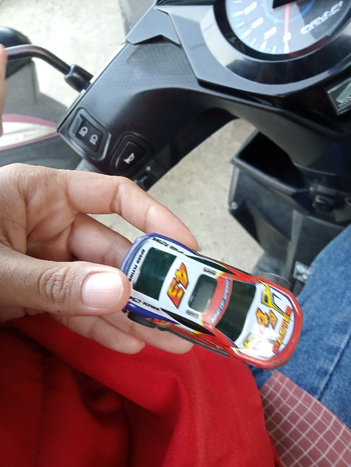 - "The image, taken in Lhokseumawe, Indonesia, presents a close-up, high-angle view of a person's right hand holding a small, multi-colored toy race car" by FM-djNUF3, licensed under CC BY 4.0