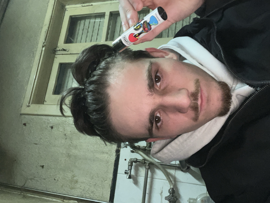 A person with their dark hair in a bun is holding a lighter over their head. They're wearing a white hoodie under a black jacket. The background shows a grimy, beige wall, a window with multiple panes, and some plumbing fixtures. The room has a utilitarian, somewhat run-down appearance. The person is looking directly at the camera.