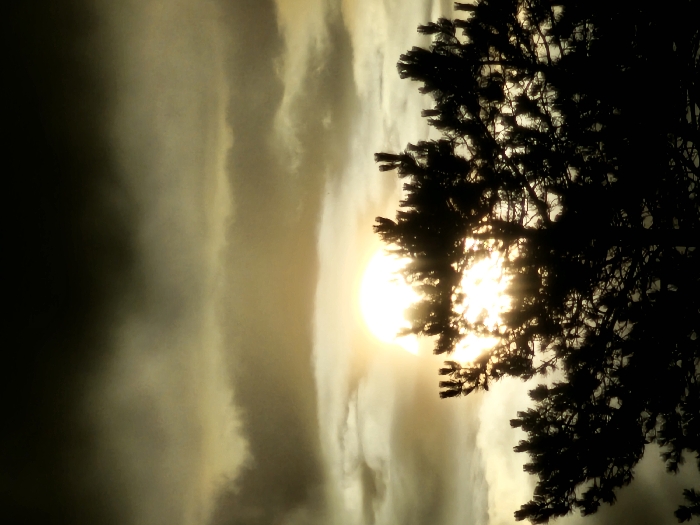 A silhouette of a tree against a dramatic sky at sunset. The sun, partially obscured by the tree's branches, radiates a golden glow. The sky is a mix of clouds and light, creating a sense of atmospheric depth. The tree's dark outline contrasts sharply with the brightness of the sun, highlighting its intricate form.