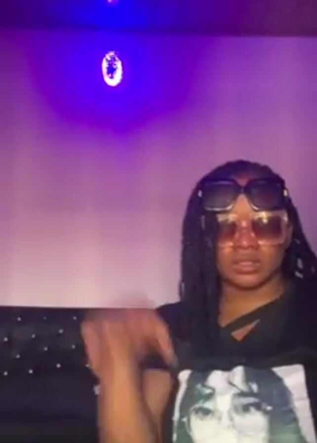 A woman with braided hair wearing two pairs of sunglasses and a black t-shirt with a graphic print is sitting inside a room with a purple light. She raises her hand in the air and then rests her chin on her hand, appearing to be thinking. A black sofa with studded details is partially visible in the background.