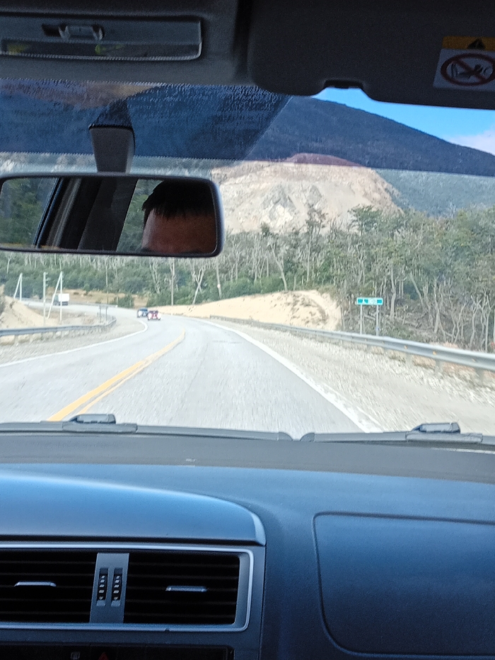 view from inside a car driving on a paved road. A yellow line marks the road's center. Trees line the side of the road, leading up to a barren mountainside. A sign is visible alongside the road. The car's dashboard is in the foreground, with air vents visible. The rearview mirror reflects the driver's head and the road behind. The sunshade is partially down.