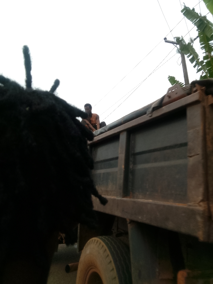 The image depicts an outdoor scene in Nsugbe, Nigeria. In the immediate foreground, the blurred dark dreadlocks of an unseen individual occupy the left and top portions of the frame, indicating a low-angle perspective from behind this person. Directly beyond, a dark-colored dump truck is the dominant subject, positioned centrally. The truck's cargo bed appears worn, with visible rust or dirt. A male individual, possibly bare-chested or wearing a light-colored top, is seated on the top edge of the truck's cargo bed, facing left. His posture suggests a resting or waiting state. In the background, a bright, overcast sky is visible, along with utility wires strung between an unseen pole and a partially visible utility pole on the right. Large green leaves, possibly from a banana tree, are also present on the far right. The road surface below the truck is minimally visible. No direct interaction between the foreground individual and the person on the truck is apparent.