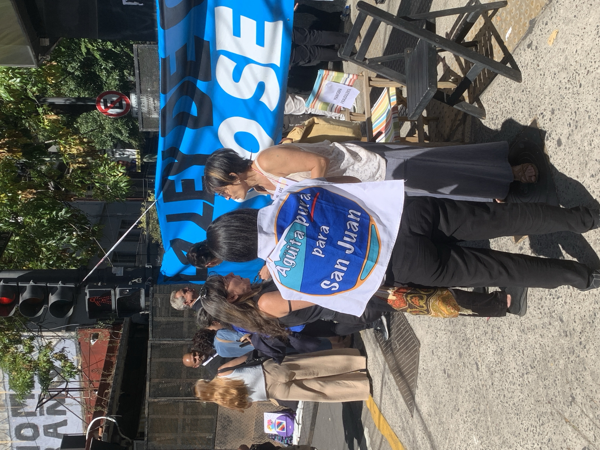 This image depicts a public gathering or protest on a city street in Buenos Aires, Argentina, under bright daylight conditions. The ground is a light-colored paved sidewalk with a yellow painted line and a metal drain grate. In the foreground, the back of a person wearing black pants and black sneakers is visible. They wear a white poncho-like garment with a prominent round blue and white sign on the back, bearing the Spanish text "Aguita pura para San Juan" (Pure water for San Juan). A colorful, patterned shoulder bag hangs from their left side. To their immediate right, another woman with short, dark hair and sunglasses perched on her head wears a light-colored sleeveless top and a long grey skirt, looking upwards and to the right. A large blue banner with partial white and black text, reading "LEY DE" and "OSE" (part of "JOSE"), spans the mid-ground, stretched above the heads of many participants. On the right side of the sidewalk, a small, striped fabric beach chair holds a white sign with the Spanish text "MANIOBRA FRAUDULENTA" (Fraudulent maneuver), positioned next to a black folding chair. Approximately ten to fifteen individuals are visible throughout the frame, standing and interacting in small groups. Notable figures include a bald man in a dark suit or shirt in the mid-ground, and a woman with long light brown hair in a white top and wide beige pants, standing near a purple backpack with a colorful geometric design on the ground. The background features include buildings, one with faded painted text ("ON AN"), and dense green foliage from trees. Street infrastructure elements are visible, including a traffic light showing a red signal for vehicles and a red 'don't walk' symbol for pedestrians, along with a circular "No Parking" sign.