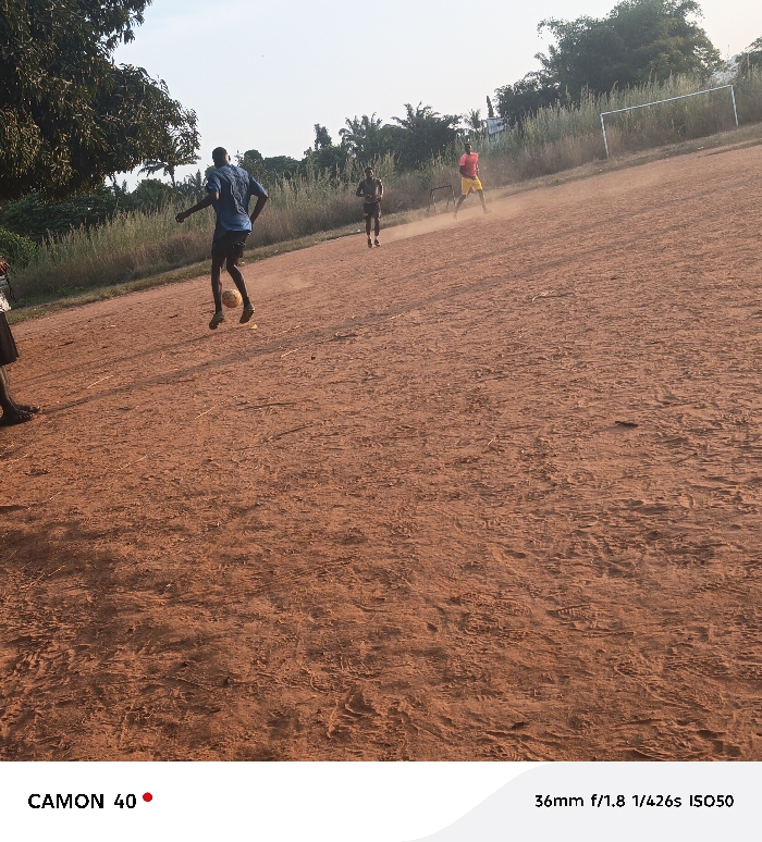 A wide shot captures a dusty, reddish-brown field where three young men are playing soccer