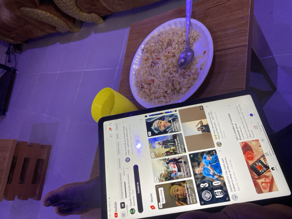 An indoor scene in Udu, Nigeria, depicts a personal space under purple ambient lighting. The primary subject is a tablet computer held in the left hand of an unseen individual, displaying the YouTube application's home screen with "Shorts" videos. The tablet shows the time as "12:59 Thu, Feb 12". Featured video titles include "HIGHLIGHTS! City cruise past Fulham" and "Day in my life as a student forex trader". To the right of the tablet, on a light brown wooden surface, sits an oval white plate containing a portion of fried rice with red and orange vegetable pieces, and a silver spoon resting within the rice. Adjacent to the plate, a yellow plastic cup holds a clear liquid. A bare foot with visible toes is partially visible on the left side of the frame. The floor is tiled in a light grey or lavender hue. In the upper left background, a stack of wooden blocks is visible, while a section of a brown, textured sofa or chair is seen in the upper right.