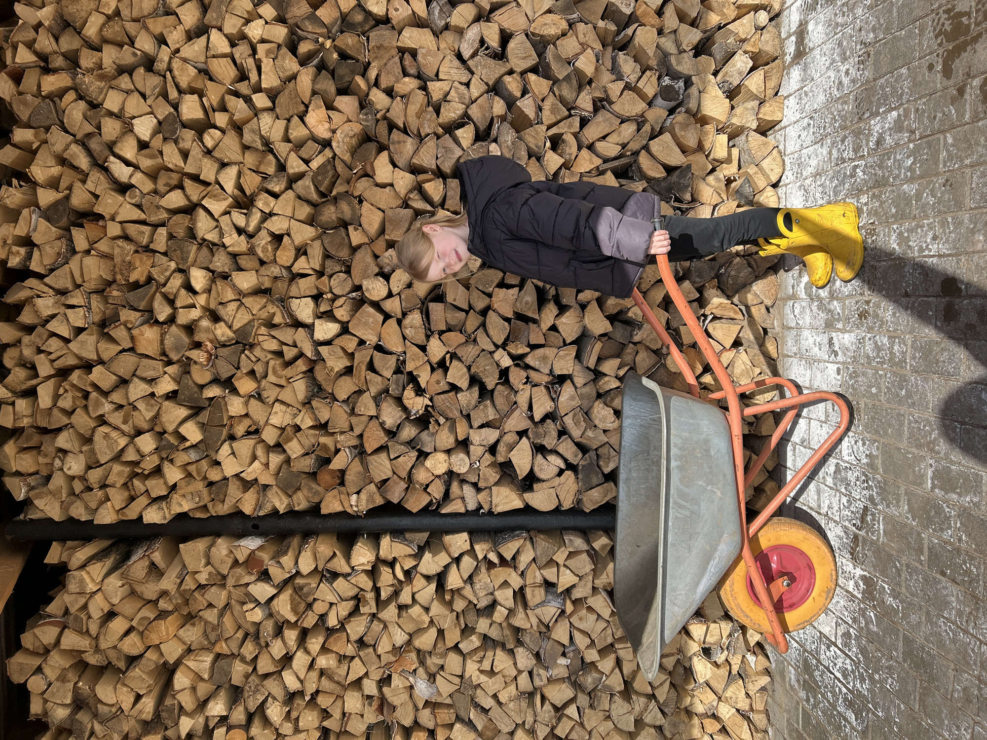 A girl lies horizontally across a stack of firewood. She wears a black puffer jacket, black pants, and yellow Crocs rain boots. She is holding the orange handles of a metal wheelbarrow with a red wheel. The wheelbarrow rests on a light-colored brick wall to the right of the frame. The photo is taken from an overhead perspective, with the scene tilted 90 degrees.