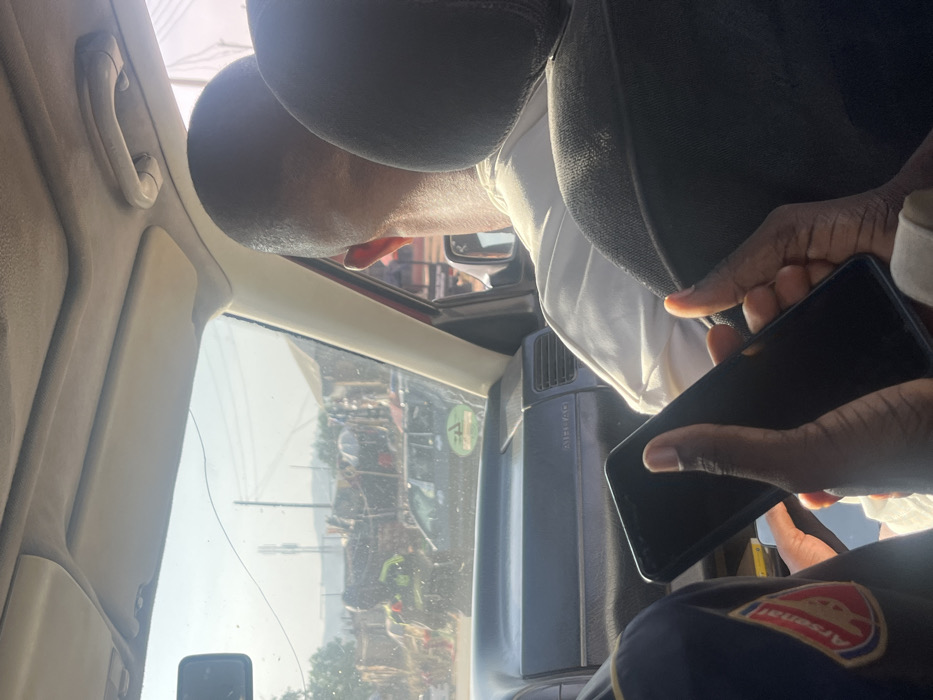 The image depicts a street scene in Nyanya, Nigeria, observed from the interior of a vehicle. In the immediate foreground, a person's dark-skinned hands are holding a black smartphone with a visible crack on its screen. This individual wears a dark garment with a red and white "Arsenal" emblem on the left side. Ahead, the back of another person's head and right shoulder are visible, indicating a driver or front passenger with a closely cropped haircut, wearing a light-colored shirt. The vehicle's interior features a dashboard with an "AIRBAG" inscription, a rearview mirror on the left, and a beige headliner with sun visors. The windshield exhibits a distinct crack extending across the upper-mid section. Beyond the windshield, a busy urban environment unfolds under a bright, hazy sky. Several vehicles are visible, including a dark sedan with a green circular logo on its side, indicative of a taxi. Another vehicle appears heavily laden with goods. A person wearing a high-visibility green vest is present near the heavily loaded vehicle. The background reveals a street market or roadside area characterized by numerous stalls, stacked goods, and indistinct figures. Utility poles and power lines crisscross the sky. Distant hills rise under the horizon, confirming the outdoor, daytime setting of an active urban landscape in Nyanya.