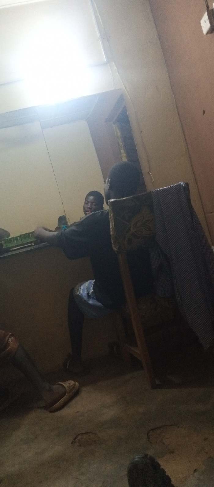 The scene depicts an interior establishment in Akwanga, Nigeria. A prominent, bright, likely fluorescent, light source is positioned high on the upper left wall, casting intense illumination and reflecting strongly in a large, rectangular mirror situated directly below it. A dark-skinned individual, appearing to be a young male, is seated on a wooden chair with a patterned, upholstered backrest, with his back partially turned towards the camera. He wears a dark short-sleeved top and light-colored shorts. A blue and white checkered long-sleeved shirt is draped over the back of his chair. His reflection in the mirror shows his face turned slightly to his left, exhibiting a smiling expression. He is positioned at a dark-colored counter where several small, rectangular green and white objects are visible. The lower leg and foot of a second individual, wearing a light-colored slip-on sandal, are present in the bottom left foreground. A faint reflection of a third individual's head is discernible in the mirror, positioned behind the main subject's reflection. The floor is concrete, displaying notable areas of wear and discoloration. The walls are painted in a light beige or brown hue. A white electrical outlet with two receptacles is mounted on the upper right wall. A dark doorway or opening is visible to the right of the mirror.