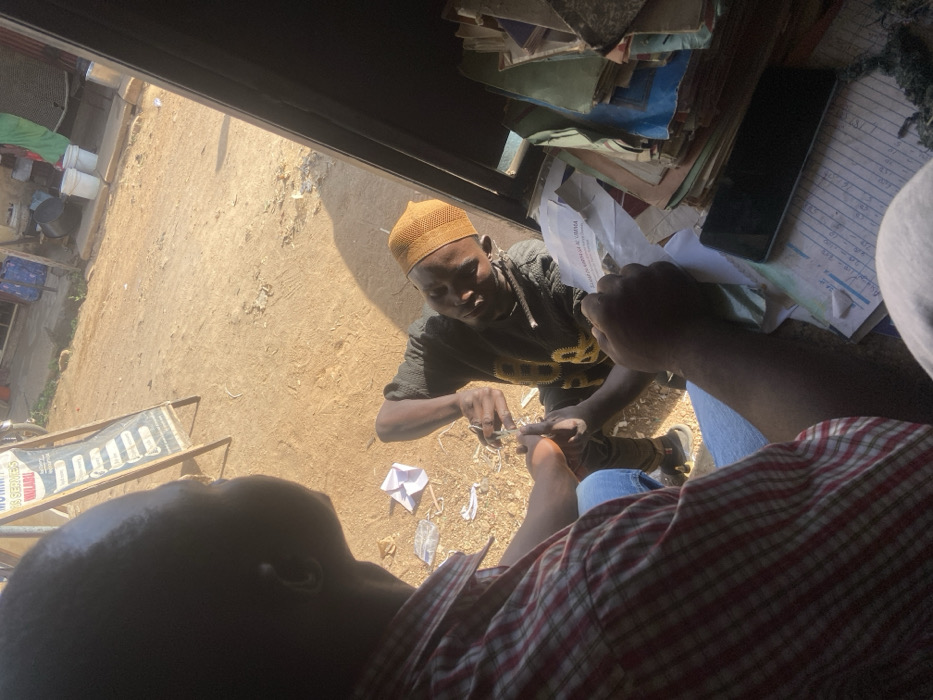 This image depicts an outdoor interaction between two dark-skinned males on a sunlit, dirt ground in Jos, Nigeria