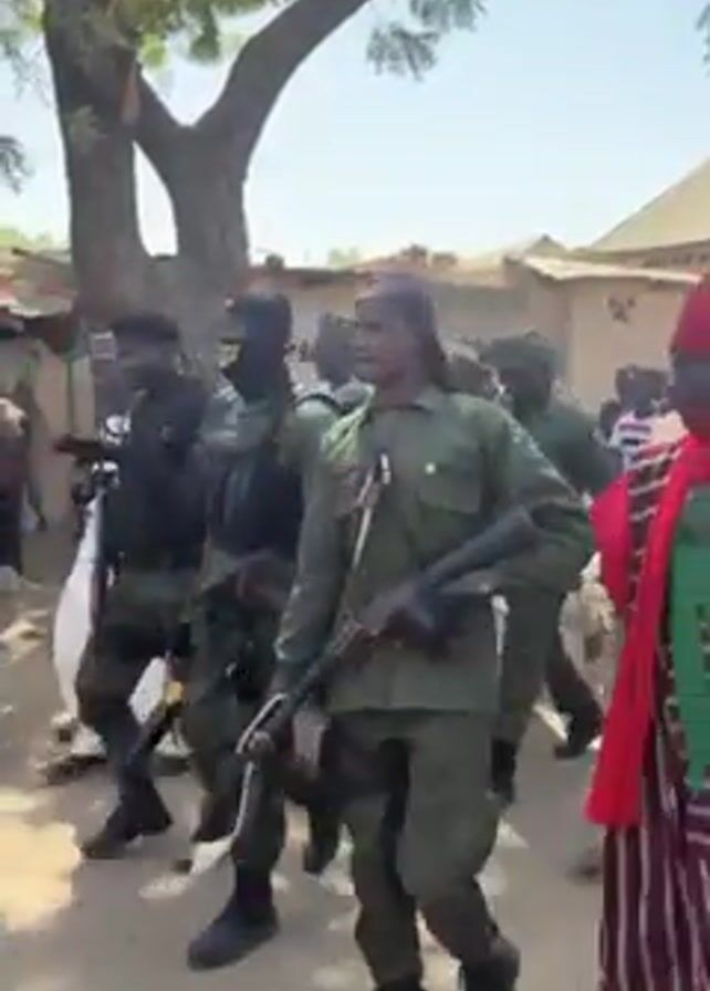 procession down a dirt road in what appears to be a village or small town. The road is flanked by buildings and a large tree with bare branches. The procession is led by an older man wearing a red headwrap and a colorful robe, followed by a group of individuals in green military-style uniforms, some carrying weapons. Other people, dressed in civilian clothing, mingle among and follow the uniformed group. The camera follows the procession at a medium distance, maintaining the perspective of someone within or alongside the group. The overall atmosphere suggests an event of local significance or celebration.