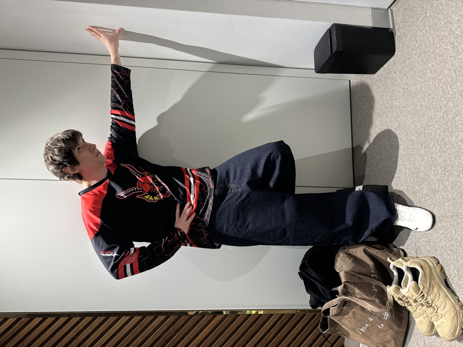In an indoor setting within the city of Moscow, Russia, a male individual stands against a plain white wall, illuminated by an unseen light source casting distinct shadows. He is wearing a black and red long-sleeved jersey featuring a red horned devil emblem on the chest and a white number '8' on the left sleeve, dark blue wide-leg denim jeans, and white sneakers on his right foot. His left foot is elevated, suggesting a balanced or posed stance. His right arm is extended, with his palm pressed flat against the white wall, and his left hand rests on his hip. His head is turned to the right, presenting a three-quarter profile, with a neutral to slightly smirking facial expression. The floor is covered in a light grey speckled carpet. To the left foreground, a dark garment, two tan canvas tote bags (one partially displaying the text "I have a lot of things to do"), and a pair of tan hiking boots are arranged on the floor. To the right foreground, a black rectangular lidded waste bin stands against the wall.