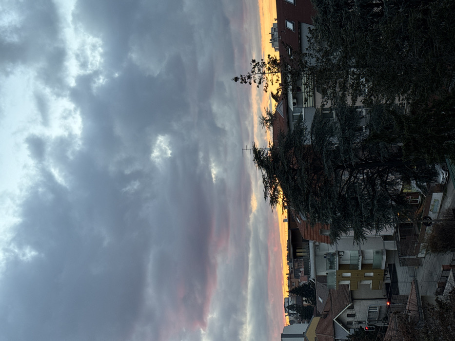 A dramatic sunset streaks the sky with hues of orange, pink, and gray above a residential neighborhood. Overcast clouds loom large, contrasting with the bright horizon. Buildings with tiled roofs and modern apartments sit nestled amongst trees. A towering pine frames the view, obscuring some of the houses. A car is parked beside a wall with graffiti. An antenna rises atop a building.