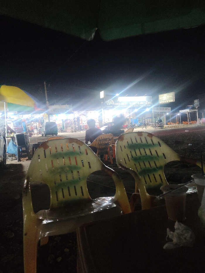 The image depicts an outdoor night scene in Peurupok, Indonesia, characterized by artificial illumination from various commercial establishments. In the immediate foreground, two empty, faded yellow-green plastic chairs with slatted backs face away from the camera, partially obscuring a dark tabletop on the right, which holds a plastic cup containing a beverage and a crumpled piece of white paper. The ground beneath the chairs appears to be dark, uneven earth or gravel. In the midground, to the left, a person wearing a striped garment is partially visible behind a yellow and green market umbrella. A blue object, possibly a bag, rests on the ground near another chair. Centrally, several silhouetted individuals are present; one person sits facing away from the viewer, while another silhouette is visible further back. Multiple motorbikes are parked or in motion. The background features a street or market thoroughfare lined with various businesses and stalls, brightly lit by white overhead lights causing significant glare. Prominent signage includes a large sign reading "Ayud HARGA SULAP Rp 21.000 (M-XL) Rp 26.820 (XXL) 10-Hari / (JUMAT-SABTU LIBUR) *BELI 1 GRATIS 1" in Indonesian. A partially visible sign indicates "COMPUTER," and further to the right, another sign reads "SERVICE HP." The overall environment suggests a lively commercial area after dark. The sky is completely dark, indicating nighttime conditions.