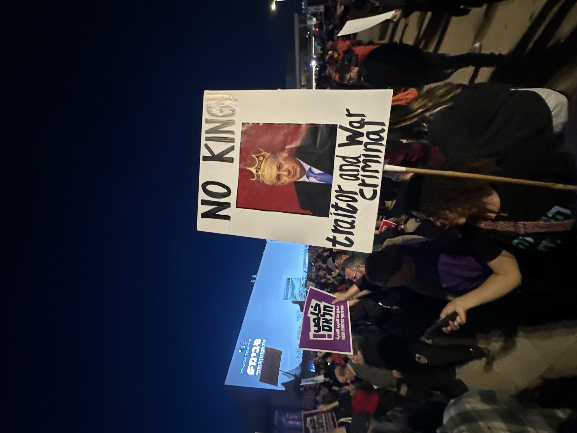 The image depicts a nighttime protest in Tel Aviv, Israel. Several people are holding signs. One sign reads "NO KING!" with a photo of a man wearing a crown and the words "Traitor and War Criminal." Another sign in Hebrew and Arabic says, "Enough! We put an end to the endless war." There is a building or structure with text in Hebrew and Arabic that refers to the city of Tel Aviv-Yafo and the National Theater. There are many people in the background and foreground, and it appears to be a crowded scene. The sky is dark.