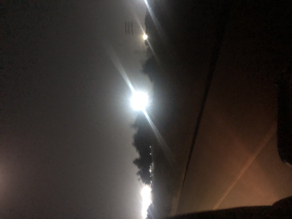 Night scene under a bridge. A bright streetlight illuminates the scene through dense fog, creating a strong glare. Below the bridge, a blurry line of lights is visible, possibly indicating a road or urban area shrouded in mist. The overall ambiance is dark, with limited visibility due to the thick fog.