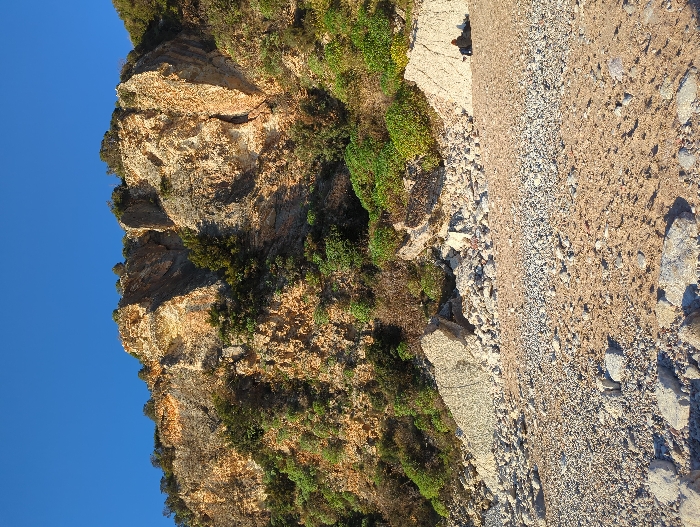 The scene depicts a rugged coastal environment in Perazića Do, Montenegro, under a clear, uniform deep blue sky. A large, stratified rock cliff dominates the upper and mid-ground, composed primarily of light brown, yellowish, and grey geological formations, exhibiting visible layers, crevices, and weathered surfaces. Sparse green vegetation, including bushes and small trees, grows on the cliff face and ledges. At the base of the cliff, a substantial accumulation of light-colored, angular rock debris and boulders extends across the mid-ground. Among this debris, two prominent, lighter-toned, somewhat geometric blocks are visible: a large, irregular block on the left and a larger, triangular-faced block with a textured surface on the right, positioned closer to the cliff. The foreground consists of a coarse-grained, light brown sandy beach surface, interspersed with scattered small, light-colored pebbles and larger rocks. A distinct band of finer, light grey pebbles runs horizontally across the mid-foreground, separating the coarser sand from the larger debris field near the cliff. In the lower right quadrant, a single individual is seated or leaning against the triangular-faced rock block. The person is wearing dark clothing. A dark, rectangular object, consistent with a bag or backpack, rests on the ground directly beside the individual. The scene is illuminated by natural sunlight, indicated by visible shadows and bright highlights on the rock formations.