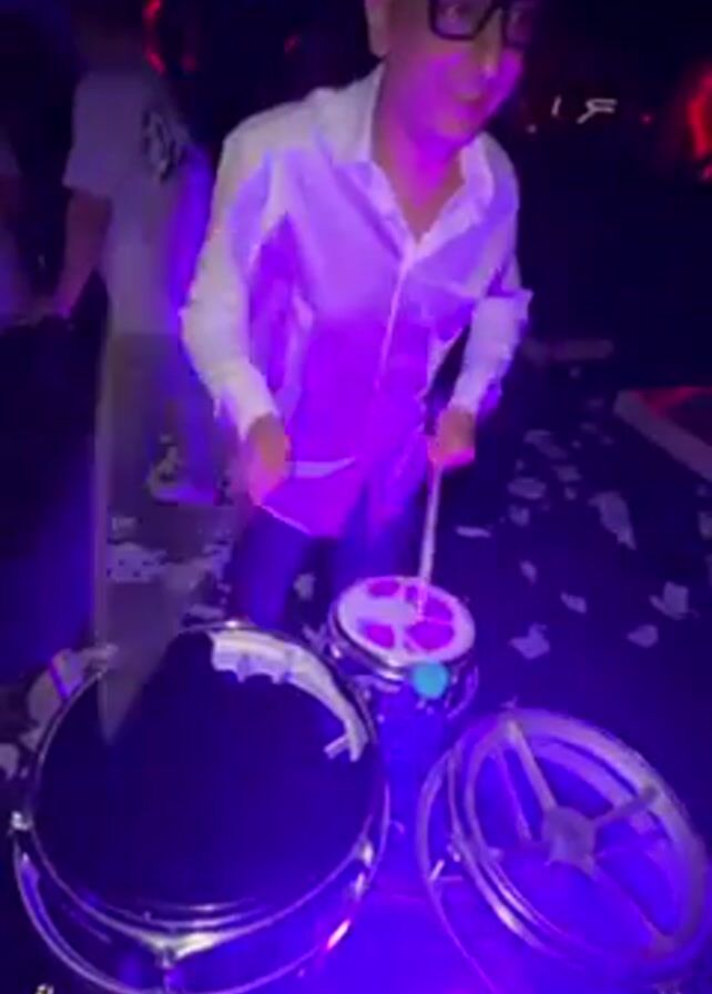 A man wearing glasses and a white shirt plays a small drum set at what appears to be a club or party