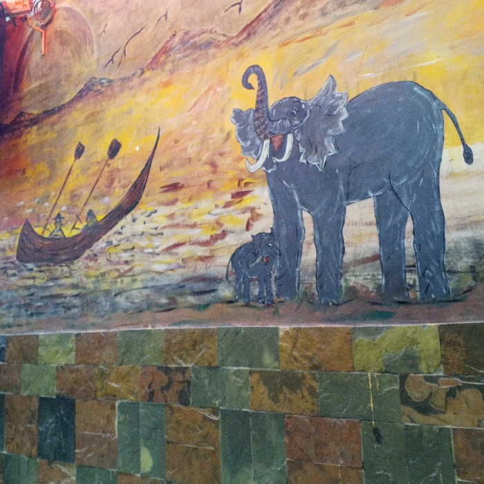 The image depicts a mural painted on a wall above a stone tile base. The mural shows an abstract landscape with a boat carrying figures and oars. An adult elephant with large tusks stands next to a smaller elephant. The background is an abstract mix of orange and yellow tones, suggesting a sunset or sunrise. The wall tiles beneath the mural are a mix of green, brown, and black stone.