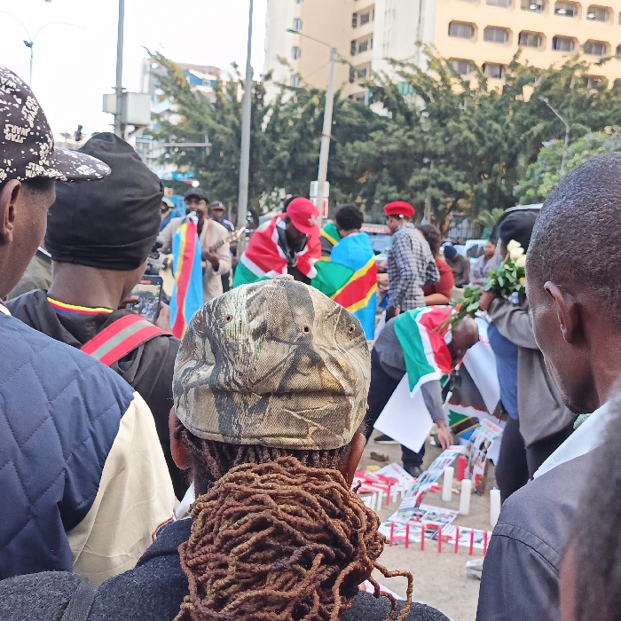 An outdoor scene in an urban area of Nairobi, Kenya, depicts a public gathering under daylight, possibly late afternoon, conditions. In the immediate foreground, the backs of three individuals are visible: one with brown dreadlocks and a camouflage baseball cap, another in a dark blue and beige jacket, and a third wearing a black head wrap with a visible red and green strap. In the mid-ground, approximately fifteen to twenty individuals are present. A central figure, facing right, is draped in the blue, yellow, and red flag of the Democratic Republic of Congo (DRC) and wears a red cap. To their left, another individual holds a microphone and a light-colored string instrument (possibly a guitar), partially obscured by a DRC flag. To the right of the central figure, an individual in a red beret and plaid shirt observes the activity. Further to the right, a person is partially covered by a DRC flag, while another individual bends forward over a ground display, draped in the red, green, blue, black, and gold flag of South Africa. This makeshift display, arranged on a paved surface, comprises numerous white candles (some with red bases) and various printed posters or fliers featuring images and text. A person on the far right holds a bouquet of white roses. The background reveals multi-story light-colored buildings, green trees, and standard street infrastructure, indicative of a city environment. The overall scene suggests a public assembly, vigil, or protest involving participants supporting both the Democratic Republic of Congo and South Africa.