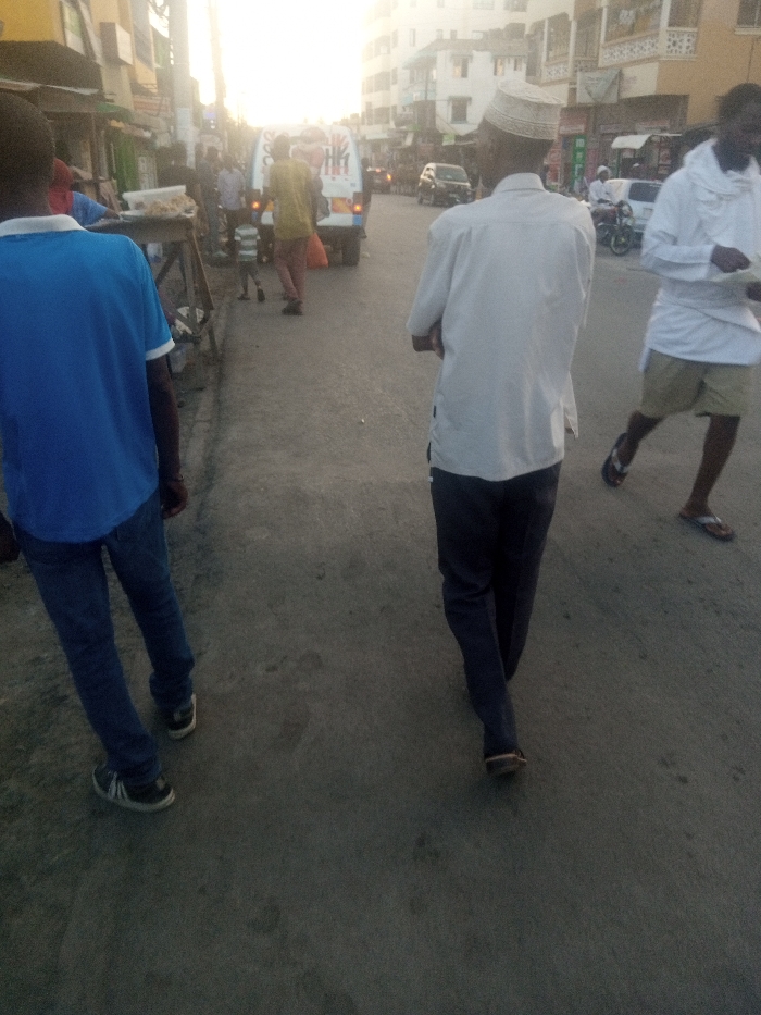 The image depicts an active street scene in Mtopanga ward, Kenya, under low-angle sunlight originating from the background, indicating either early morning or late afternoon. The vantage point is positioned behind several pedestrians on a paved thoroughfare. In the immediate foreground on the left, a person is visible from the waist down, wearing a blue t-shirt with white trim on the sleeves, dark blue jeans, and black sneakers with white soles, walking away from the viewer. Centrally positioned in the foreground, a man in a white long-sleeved tunic, dark trousers, and a light-colored kufi walks away, with his hands clasped behind his back. On the far right foreground, a partially visible man wears a white long-sleeved top, light-colored shorts, and dark flip-flops, appearing to hold an unspecified item in his hands while walking towards the right. The midground reveals a bustling street environment. On the left sidewalk, a makeshift wooden stall displays light-colored items, with multiple individuals gathered around it. A person in a yellow shirt and reddish-brown trousers is seen walking past the stall, near a white van with visible rear graphics. A small child is also walking in the vicinity of the stall. Further down the road, a dark-colored car is present, and a motorcycle is visible on the right. Multi-story buildings, consistent with commercial or residential structures, line both sides of the street, featuring windows and various storefronts. The background is significantly overexposed by direct sunlight, which limits detail visibility of distant elements. The road surface is dark, appears paved, and exhibits signs of wear.