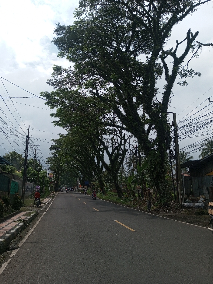 The image depicts a paved two-lane road in Sandamal Eliya, Sri Lanka, observed under an overcast sky. The road features a solid yellow line on the left and a dashed yellow line on the right, indicating traffic flow away from the viewer. On the left side, a concrete sidewalk with an elevated curb runs parallel to the road. A individual on a red scooter is stationary on this sidewalk in the foreground. Further down the left, multiple utility poles with a dense network of overhead power lines are visible, along with some residential structures behind a wall. The right side of the road is bordered by a continuous row of large, mature trees, their dark green foliage and thick branches heavily covered in moss and epiphytes, forming a canopy that recedes into the distance. A male subject, wearing a light-colored shirt and dark pants, walks away from the camera on the dirt shoulder adjacent to these trees. Another utility pole with numerous overhead wires stands near the foreground trees. Further along this side, a rustic structure constructed from corrugated metal is present, with several white sacks piled near its base. Traffic includes at least two scooters moving away from the camera; one dark-colored scooter in the right lane midway down the road, and another red scooter further in the distance in the same lane. Additional vehicles and buildings are discernible in the far distance, suggesting an active urban or semi-urban environment.