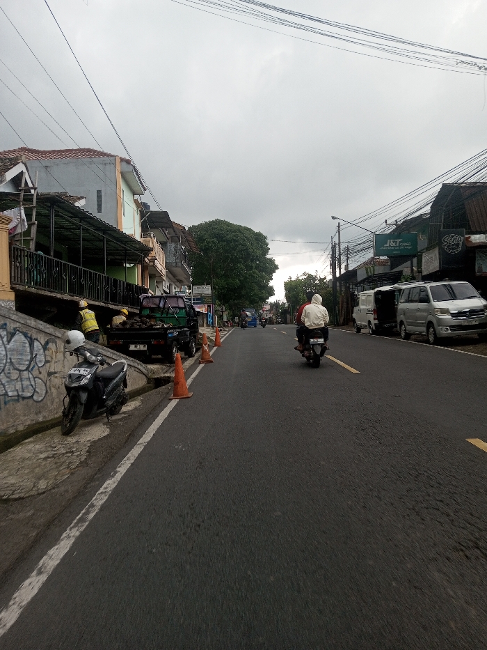The image depicts an urban street scene in Kandapola, Sri Lanka, under an overcast sky. The asphalt roadway features a solid white line marking the left shoulder and dashed yellow lines in the center. On the left side of the street, in the foreground, a concrete retaining wall exhibits black graffiti. A black scooter with a white helmet resting on its seat is parked on the sidewalk next to this wall. Behind the scooter, a green pickup truck is parked by the curb, its bed loaded with dark material. Two individuals are partially visible near the truck; one wears a yellow vest, and another wears a light-colored shirt, both appearing engaged in an activity by the truck or the elevated structure above it. Three orange traffic cones are positioned on the street adjacent to the curb, extending past the pickup truck. Beyond this, multi-story buildings with tiled roofs and balconies line the street, some featuring awnings. A large tree with dense green foliage is prominent mid-ground on this side. On the right side of the street, two individuals are riding a motorcycle away from the viewer. The passenger wears a white hooded garment, and the driver wears a red shirt. Further down, two silver-colored vans are parked on the roadside. Buildings with commercial signage, including "J&T Cargo" and "SENA," are visible on this side. A street light pole stands near the parked vans. Overhead, numerous utility lines crisscross the scene against the grey, overcast sky. The overall lighting is diffuse, consistent with an overcast day. Other vehicles and indistinct figures are visible in the distance, indicating general street activity.
