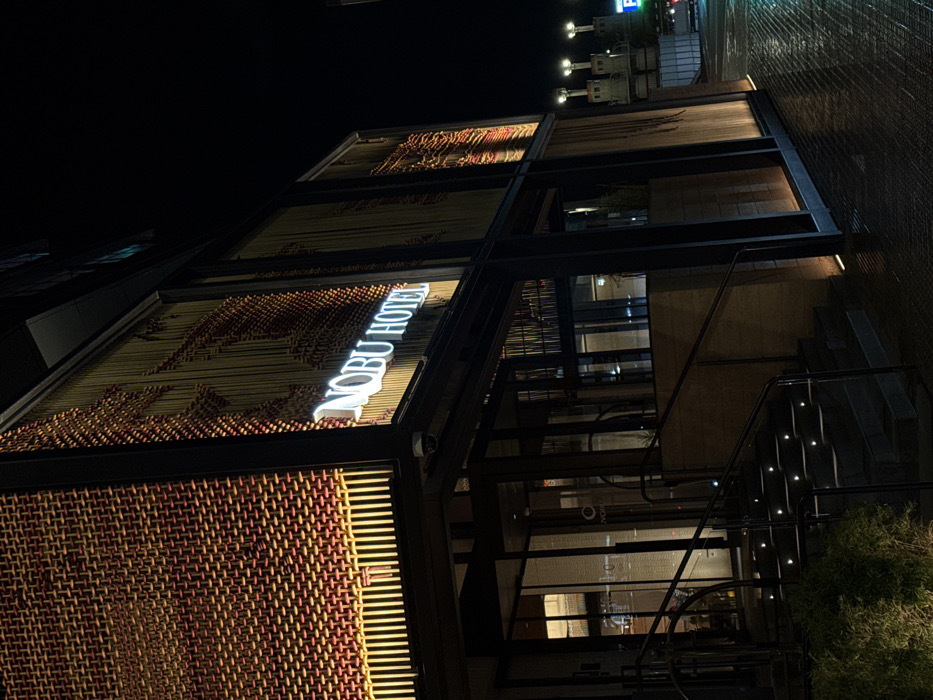 The Nobu Hotel building is captured at night, showcasing its unique architectural design