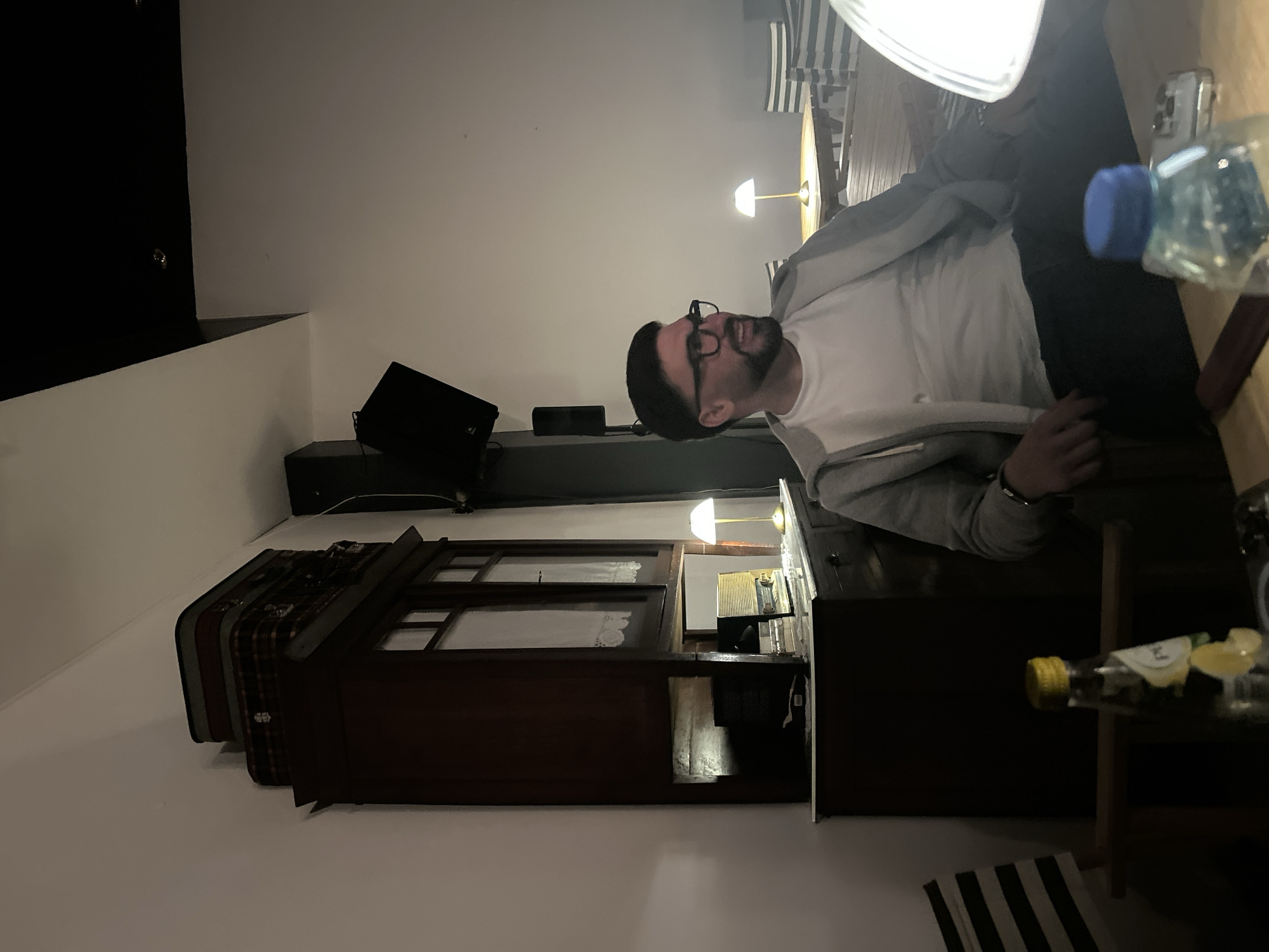 A man with glasses is seated at a wooden table, wearing a white t-shirt and a grey jacket. On the table are a water bottle, a smartphone, and a small bottle of alcohol. Beside the table is a wooden chest of drawers, and stacked to the side are three vintage suitcases. Behind the chest of drawers are a black speaker and a small spotlight. In the background, there are white and black striped chairs around a table. It is difficult to pinpoint the exact location within the city of Mirandela, Portugal from the image alone.
