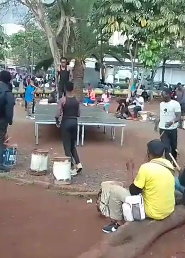 public square with many people gathered. In the center, a group of people is performing on a small, portable stage. Several individuals are playing drums, sitting around the periphery of the stage. There are people standing and watching the performance, while others are seated on benches. The area is surrounded by buildings and trees. The ground is mostly dirt, with some grassy areas.
