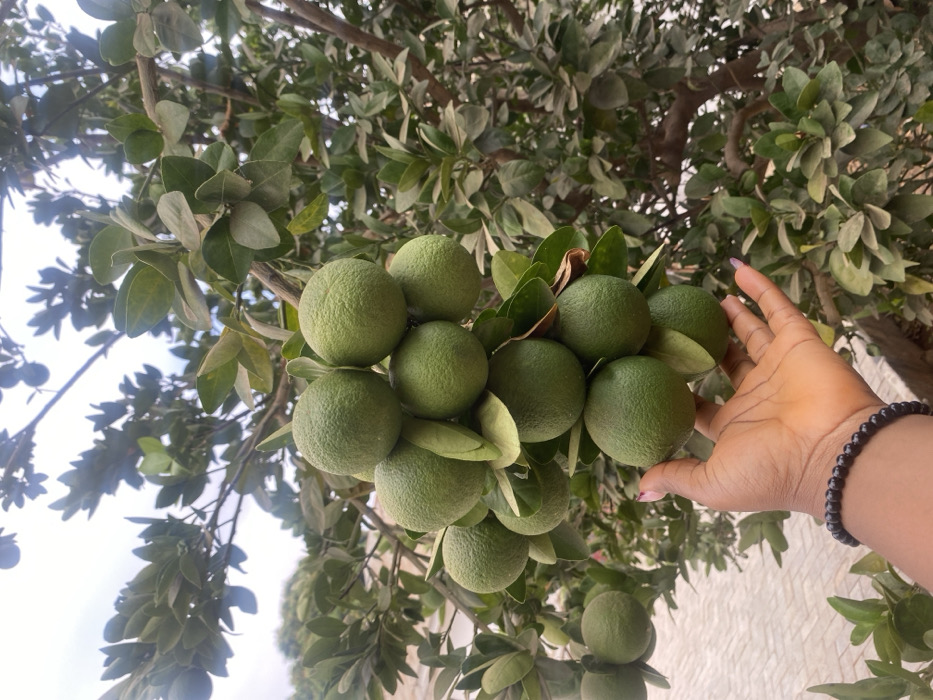 - "A close-up shot captured in Nakuse, Nigeria, displays a human hand interacting with a cluster of approximately 16 unripe, green citrus fruits, likely oranges, hanging from a tree branch" by FM-HiVvn1, licensed under CC BY 4.0