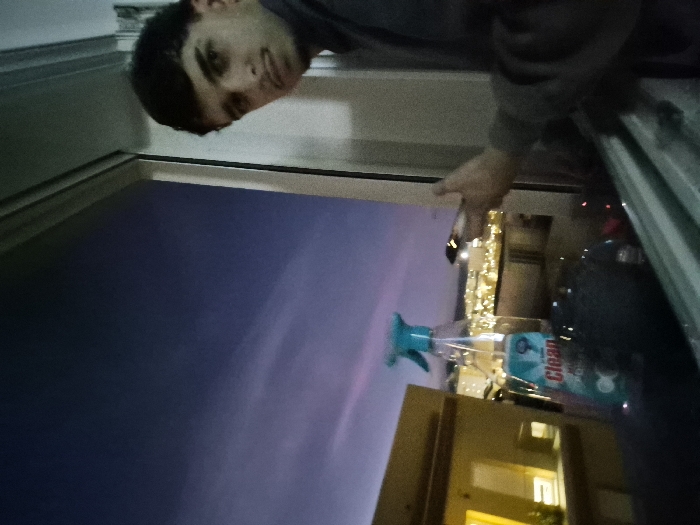 The image depicts a dusk or nighttime scene in Bragança, Portugal, observed from an interior vantage point through a window. The sky exhibits gradients of deep purple and dark blue, with faint cloud wisps. Below the horizon, numerous yellow and orange city lights are visible, indicating an urban landscape. To the extreme left, a portion of a building with yellow-illuminated windows is present. In the lower-left foreground, a clear plastic spray bottle featuring a light blue trigger and a 'Clean' label in red and white text stands on a dark, flat surface, partially obscuring a dark, rounded object beneath it. A male subject occupies the right side of the frame, looking directly at the camera. He has dark hair, a mustache, and a short beard, and is dressed in a dark, long-sleeved top. His right hand is raised, with the thumb and index finger extended in an open gesture.