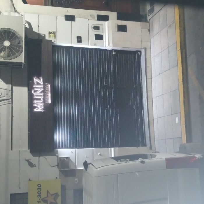 building facade with a closed metal shutter. A sign reading "MUNIZ Rotiseria" is visible on the side. An air conditioning unit is mounted on the wall. A white vehicle is parked partially in front of the building. A yellow sign with a star and a phone number is visible on the left. The building is adjacent to a tiled walkway with a yellow stripe.