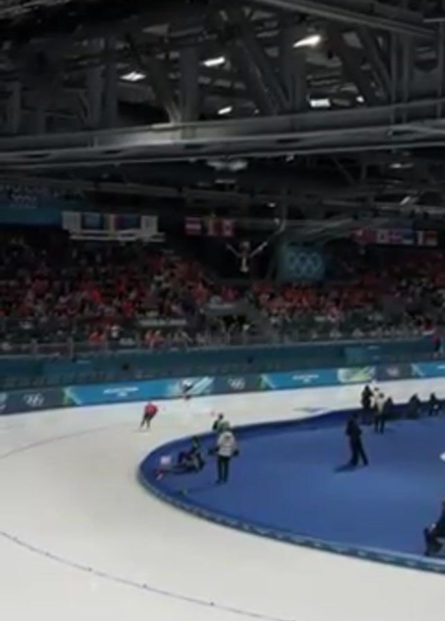 n Olympic speed skating event from an elevated perspective in an indoor stadium