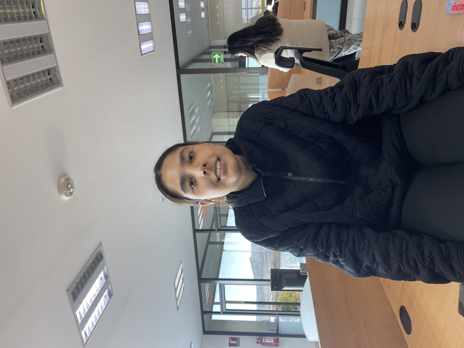 A woman in a black quilted jacket smiles at the camera. She sits in an office or library setting with large windows showing a distant mountain. Another person is visible in the background. Fluorescent lights illuminate a white ceiling. A fire extinguisher is visible near the base of the windows. The woman appears to be seated at a desk.